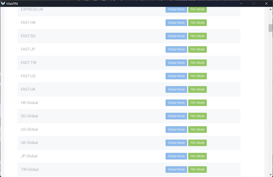 // https://vilavpn.com/index.php?rp=/download全局模式将接管发送到系统代理或本地主机的所有流量。