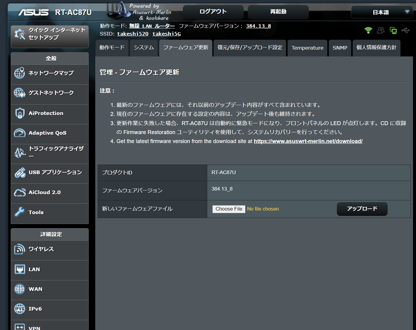 Merlinファームウェアなど、お使いのルーターモデルと互換性のあるファームウェアをダウンロードします。